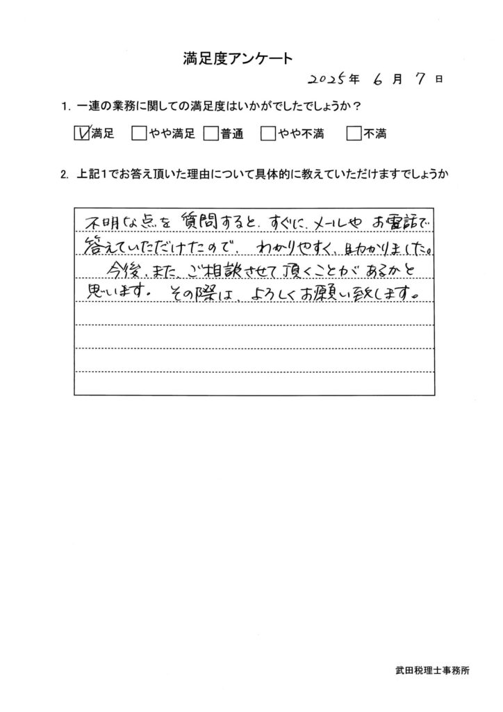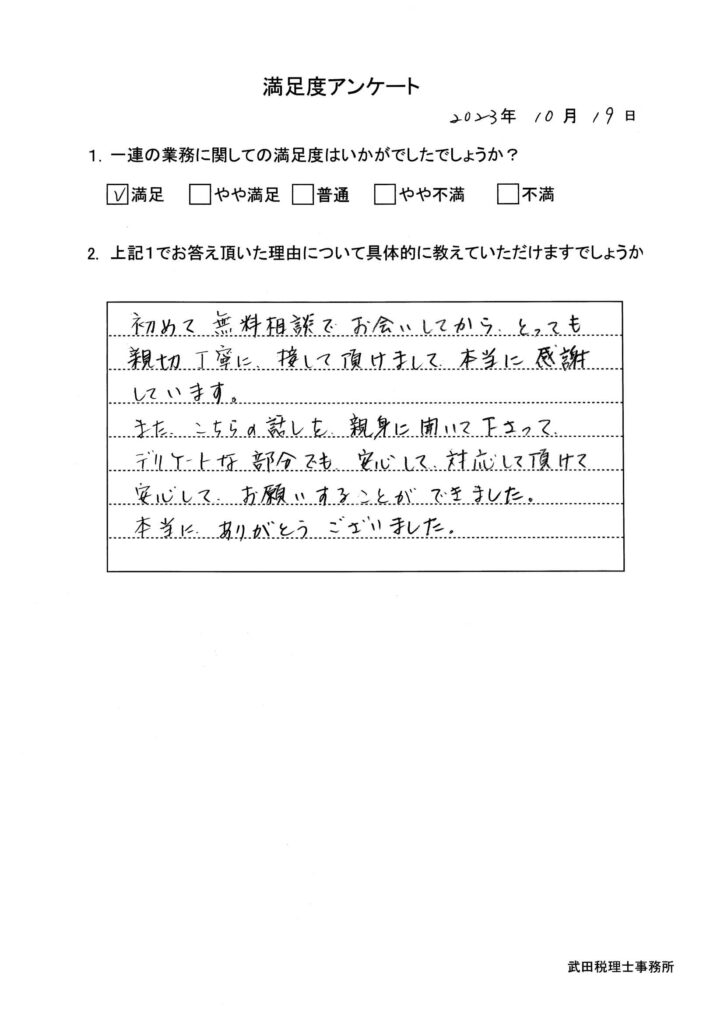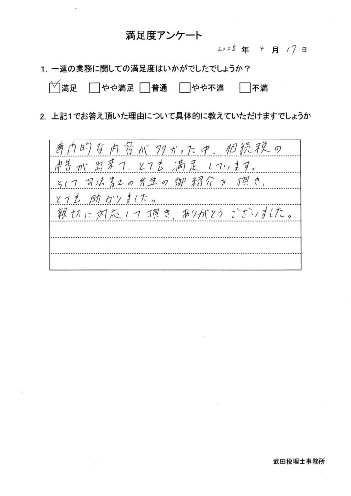 専門的な内容が多かった中、相続税の申告が出来てとても満足しています。そして司法書士の先生の御紹介を頂きとても助かりました。親切に対応して頂きありがとうございました。
