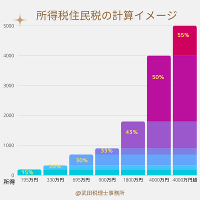 累進課税は上記の図で色分けしているとおり、それぞれの所得が一定ラインを超えると次の段階の所得税が課される仕組みになっています。
